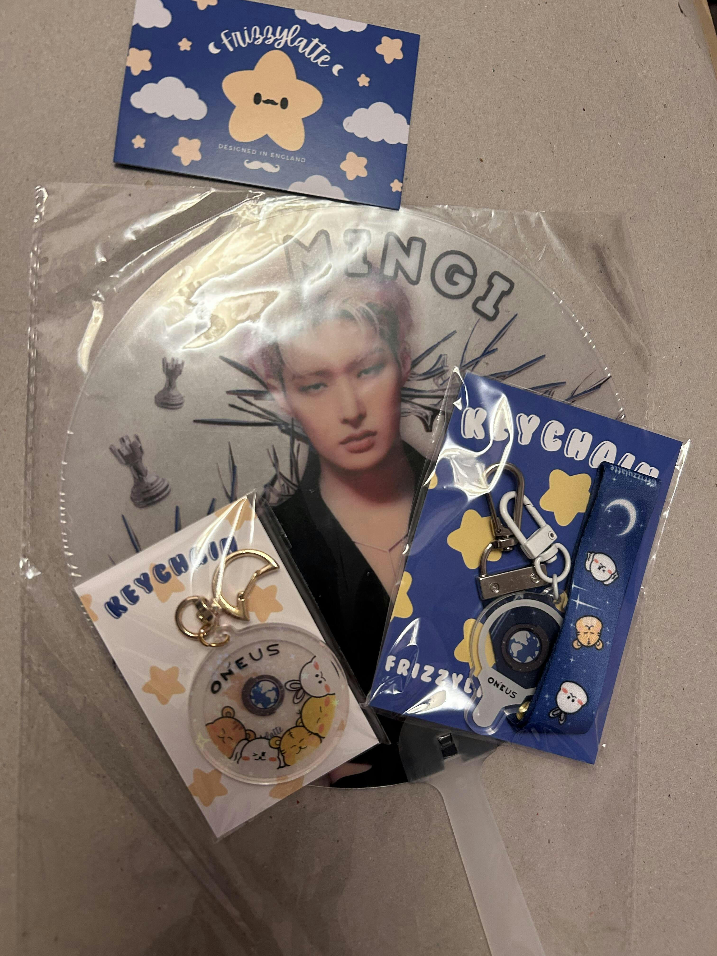 A Fabric Hand Strap with the faces of the band’s characters. Comes in blue. The group’s Lightstick Keychain included